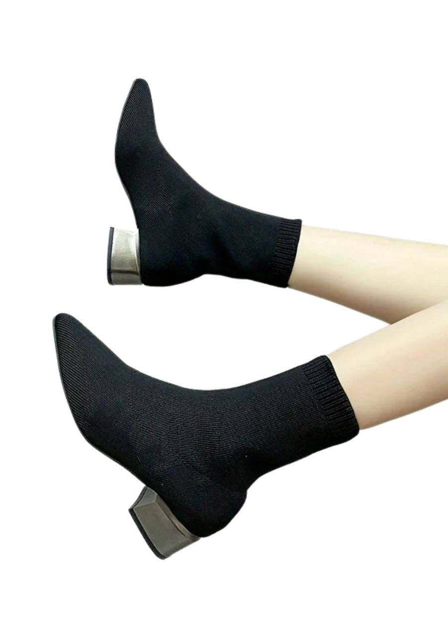 These women’s ankle sock boots feature a sleek pointed toe, a medium square heel (3–5 cm), and a slip-on design for effortless wear. Crafted with a knitted upper, PU shaft, and cotton lining, they offer both style and comfort for winter. The fabric insole and rubber outsole provide durability and support, while the solid pattern and sewing details add a fashionable touch. Handmade and designed with a slight platform (0–3 cm), these boots fit true to size and are perfect for a chic, sexy look during the colder months.