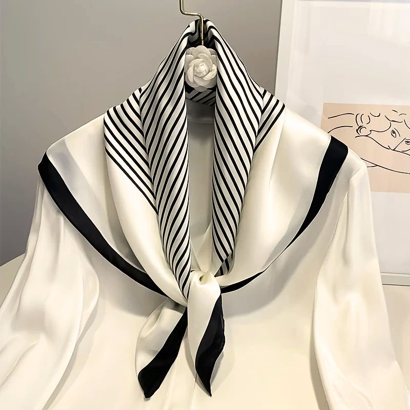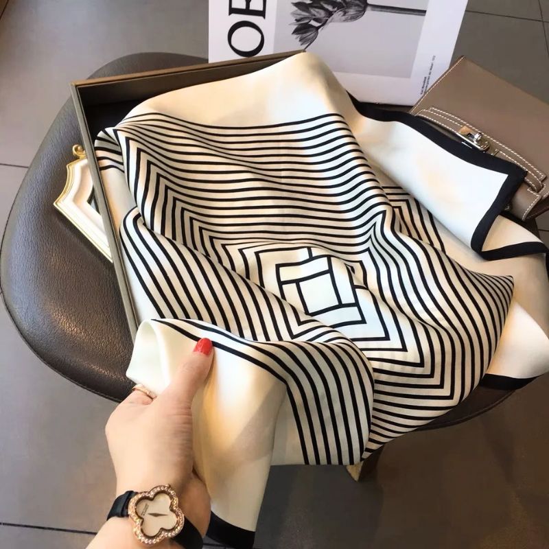 With its black geometric stripes on a white background, this 70x70 cm piece is crafted from premium-quality polyester, finished to evoke the luxurious feel of silk.